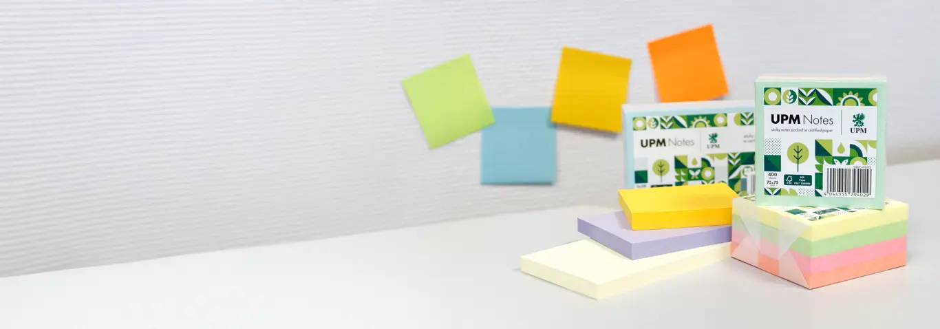 Our sticky notes are part of UPM Adhesive Materials. We offer a broad range of colorful, high-performing sticky notes and related self-adhesive products under our brands UPM Notes, inFO and UPM Protect. As one of the largest manufacturers of sticky notes in the world, we are a strong and reliable partner for your sticky notes business.