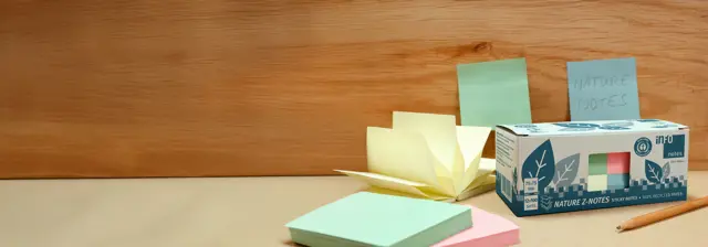 • High-performing sticky notes products in plastic-free, recyclable packaging